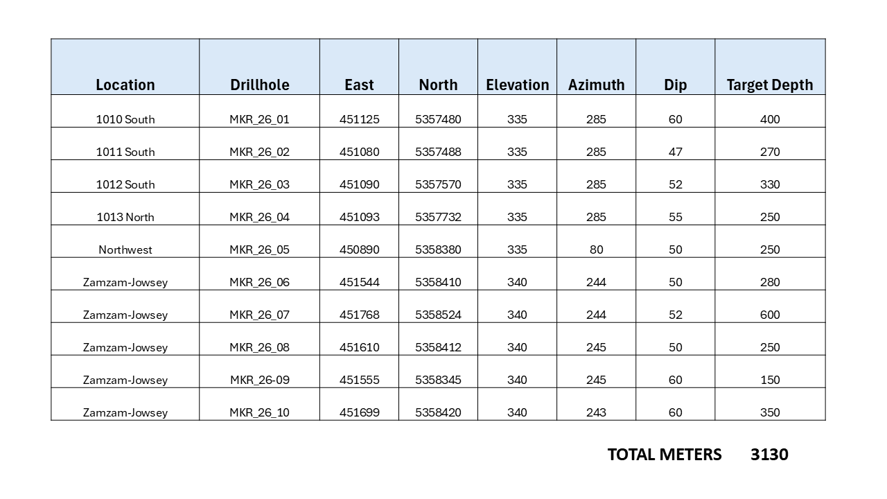 The proposed four (4) hole drilling with a combined total of 1,250 meters at the 1010 North and 1010 South zones will test the lateral and vertical extents of the bonanza grade gold intersection from hole MKR-24-002, which intersected 77.4 gpt gold over 6.90 meters, including 445.0 gpt gold over 1.20 meters at the 1010 South.