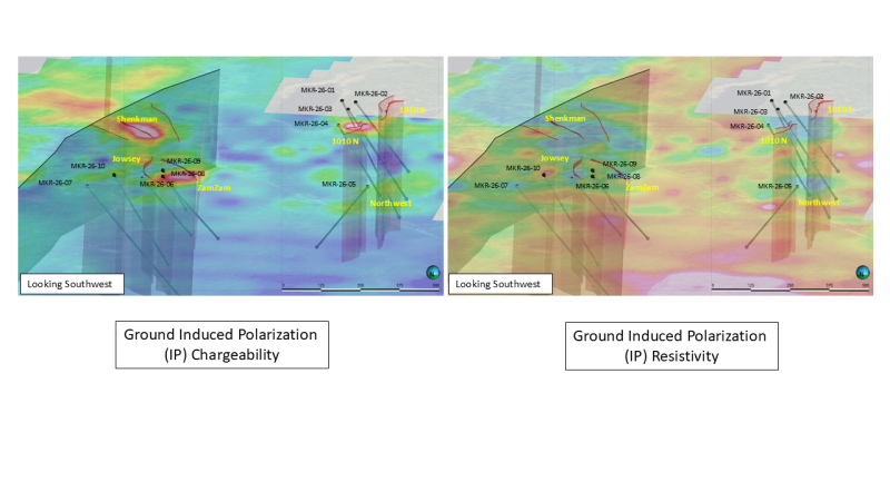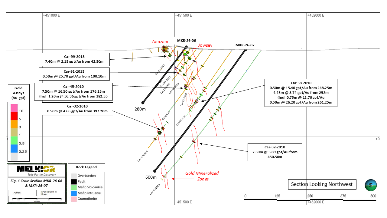 Figure 5: Drill Cross Section highlighting the proposed drillholes MKR-26-06 and MKR-26-07 in relation to historical drilling at the Zamzam-Jowsey Zones.