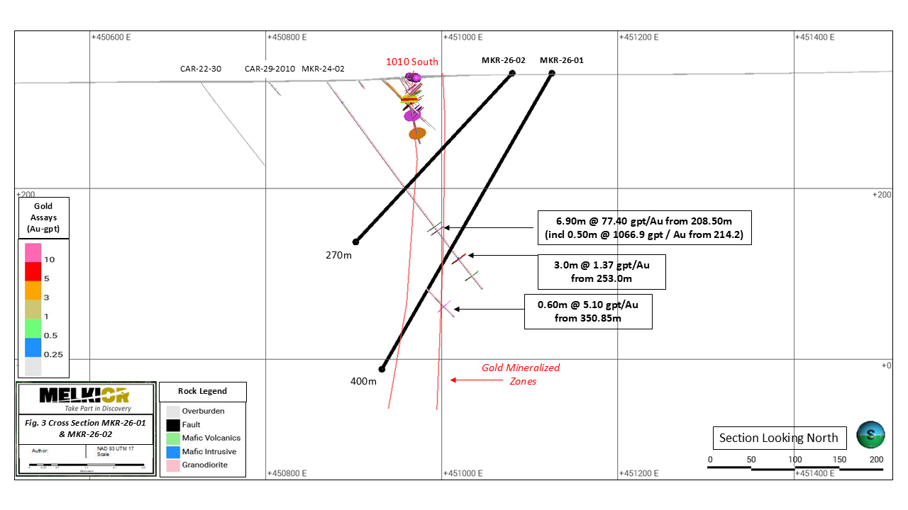 Figure 4: Drill Cross Section highlighting the proposed drillholes MKR-26-01 and MKR-26-02 in relation to recent high grade gold drill intercepts from hole MKR-24-002 and historical drilling at the 1010 South Zone.