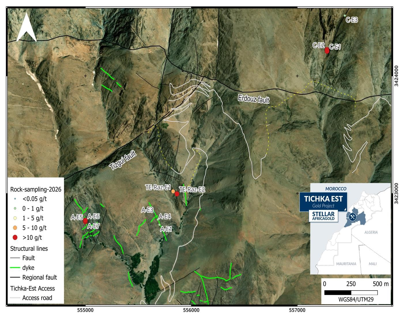 Stellar AfricaGold - Tichka Est Gold Project Momentum Builds as Technical Program Advances; High-Grade Rock Sample of 218.15 g/t Au Returned Between Zones A and B